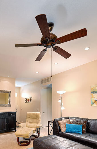 Professional installation of new ceiling fans in bedrooms, living areas, patios and offices, with options including standard fans, modern designs and custom mounting heights.